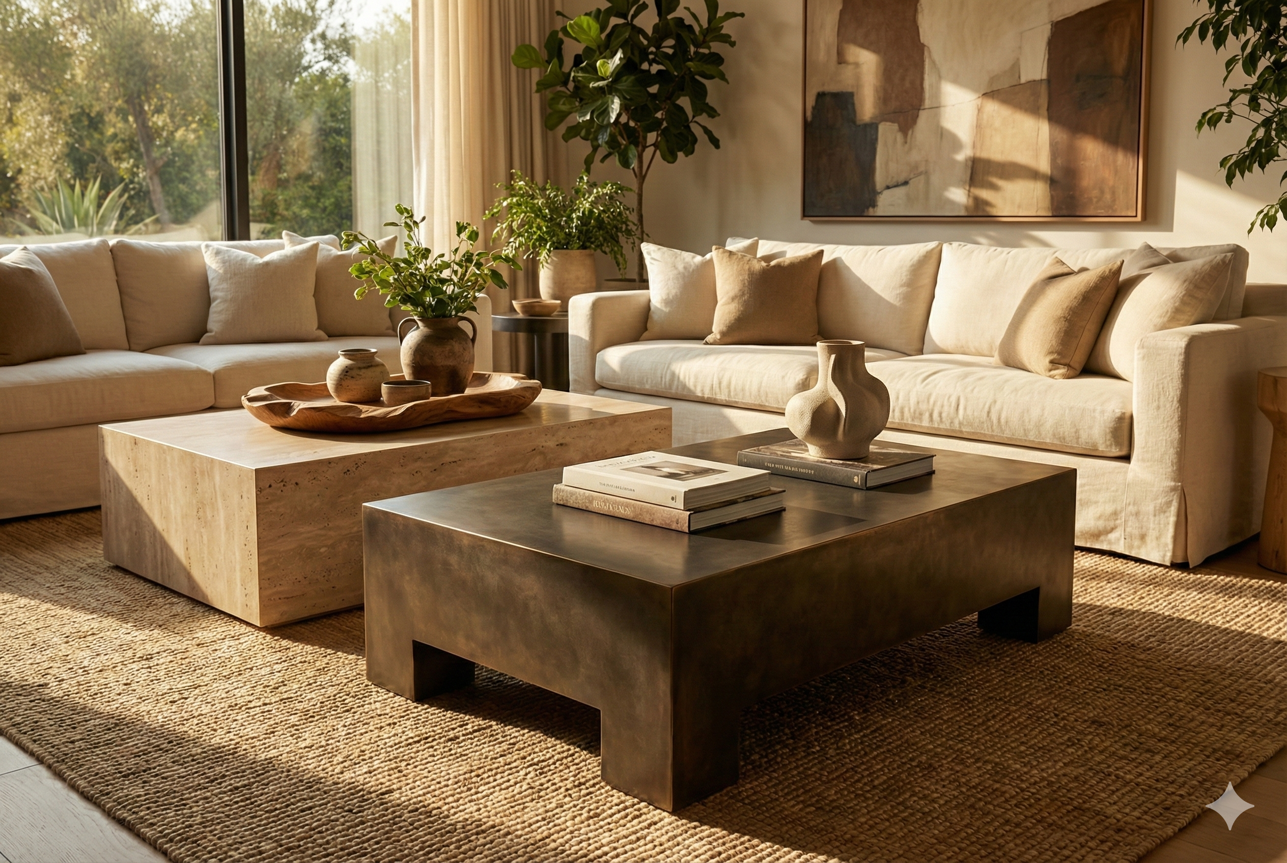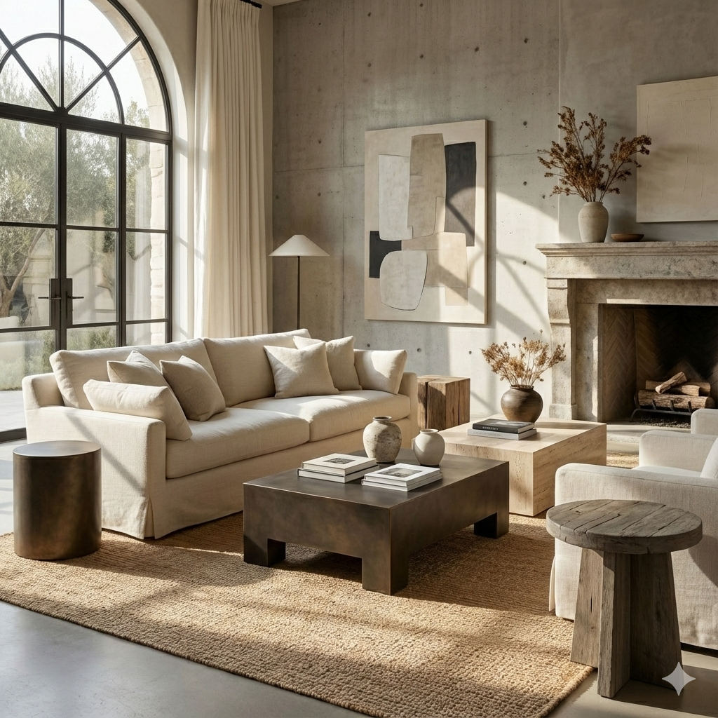 Define your living space with the raw beauty of honed travertine and the warmth of aged bronze
